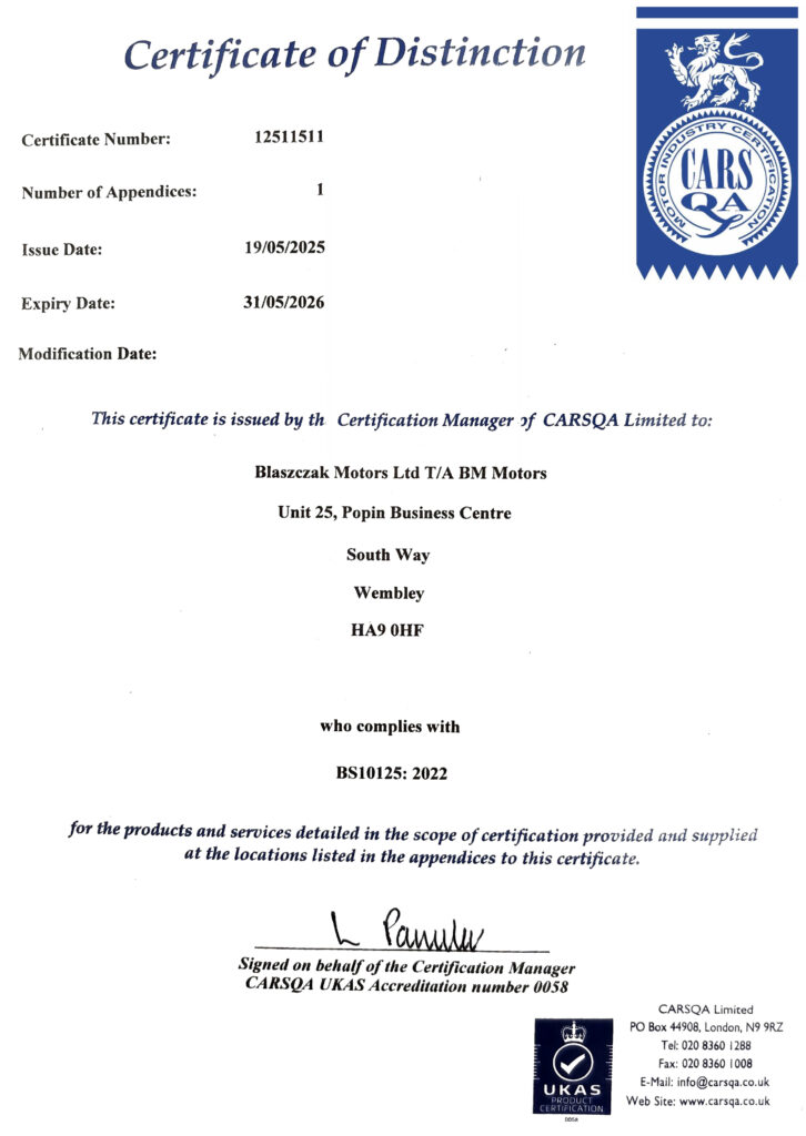 Established over a decade ago, BM Motors has proudly served the local community with the highest quality of servicing and mechanical repairs. Our dedication to excellence has been officially recognised — we are proud to hold a Certificate of Distinction from the CARSQA Motor Industries Certification, confirming our compliance with the BS10125:2022 standard for vehicle repair.